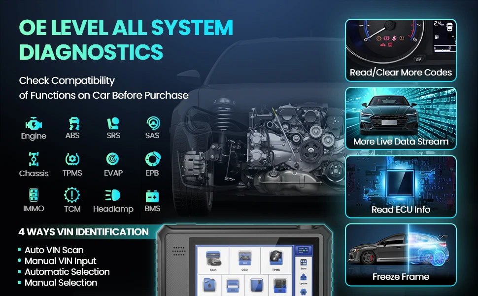 OE-Level Full Systems & Subsystems Diagnosis Lifetime Free :Engines, Transmission, Airbags/Immobilizer, IMMO Key Coding, ABS, Cruise Control, Instruments, Self Leveling Suspension systems, Seats, Doors, Gateway, Steering Angle, Air Suspension, Body Systems, Electronic Power Steering & Motor Assisted, Power Steering, Tyre Pressure, Rain Sensors, 4WD System, etc.