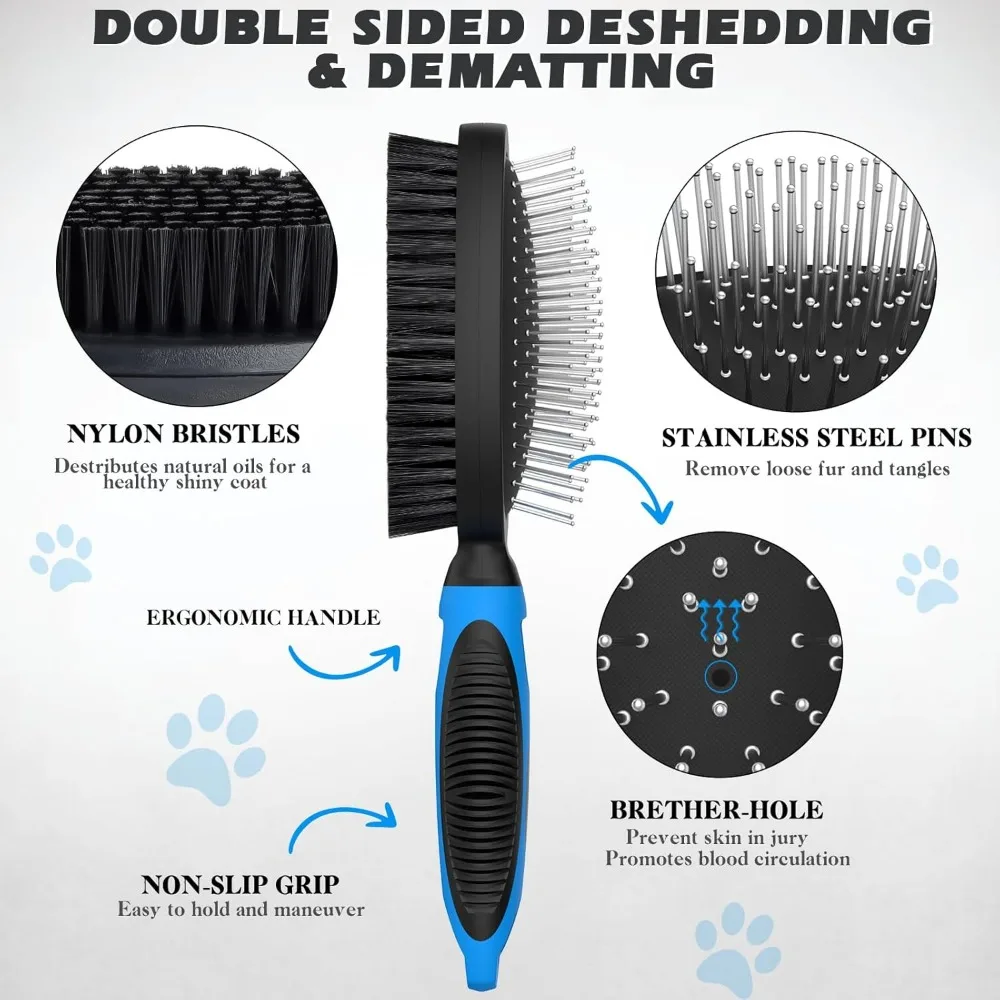 🐾【Double Sided Dog Hair Brush】The stainless steel pin brush removes pet hair effectively while the air-cushioned design massages the skin, promoting circulation without causing harm. The nylon brush side adds shine and health to the coat. Ergonomic handle for comfortable use.